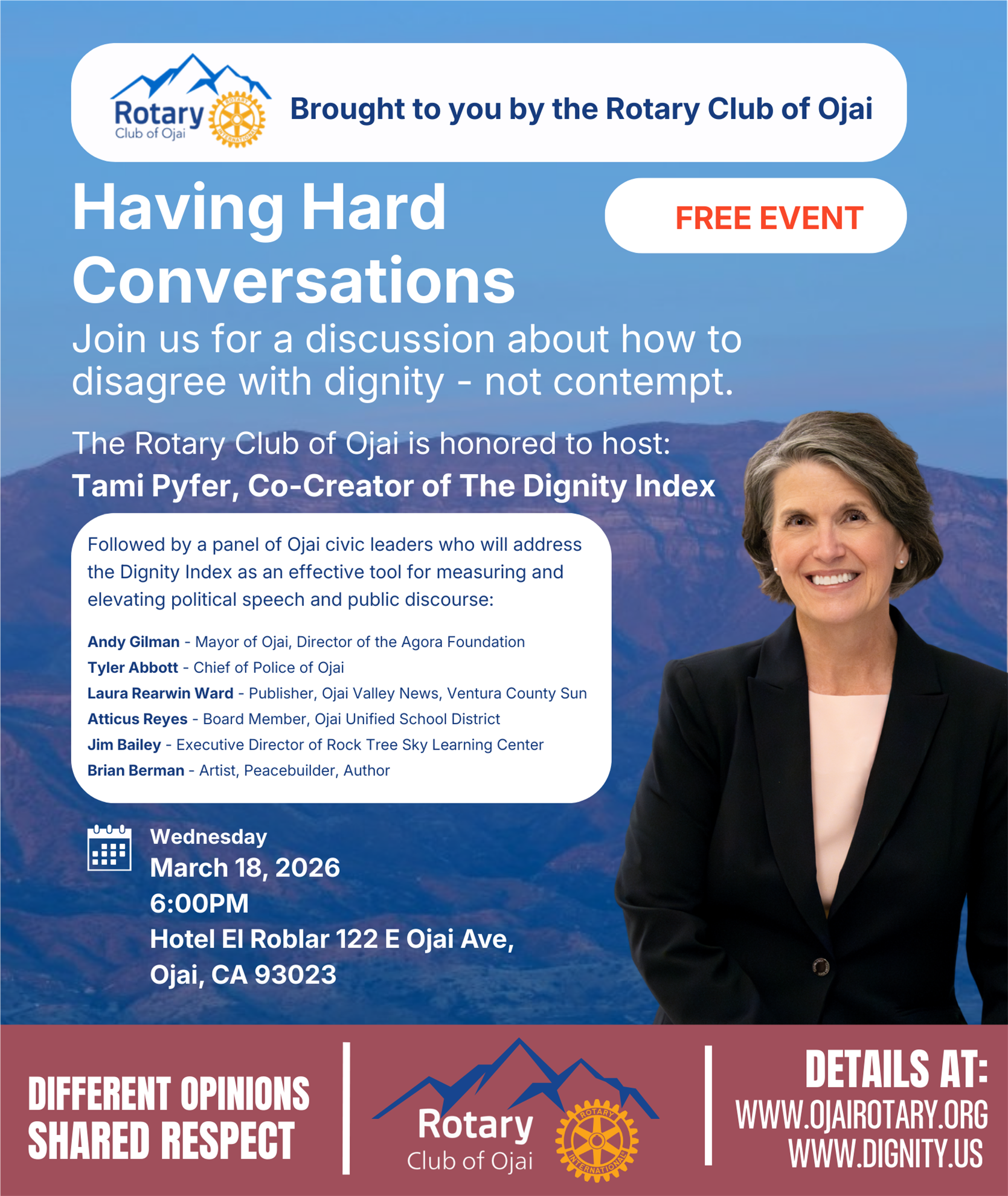 The Rotary Club of Ojai believes that strong communities depend on the ability to talk with one another — even when we disagree. At a time when public conversations can feel increasingly heated, our Peace Committee is inviting the community to explore a different approach: how to discuss difficult issues while still treating one another with dignity and respect.